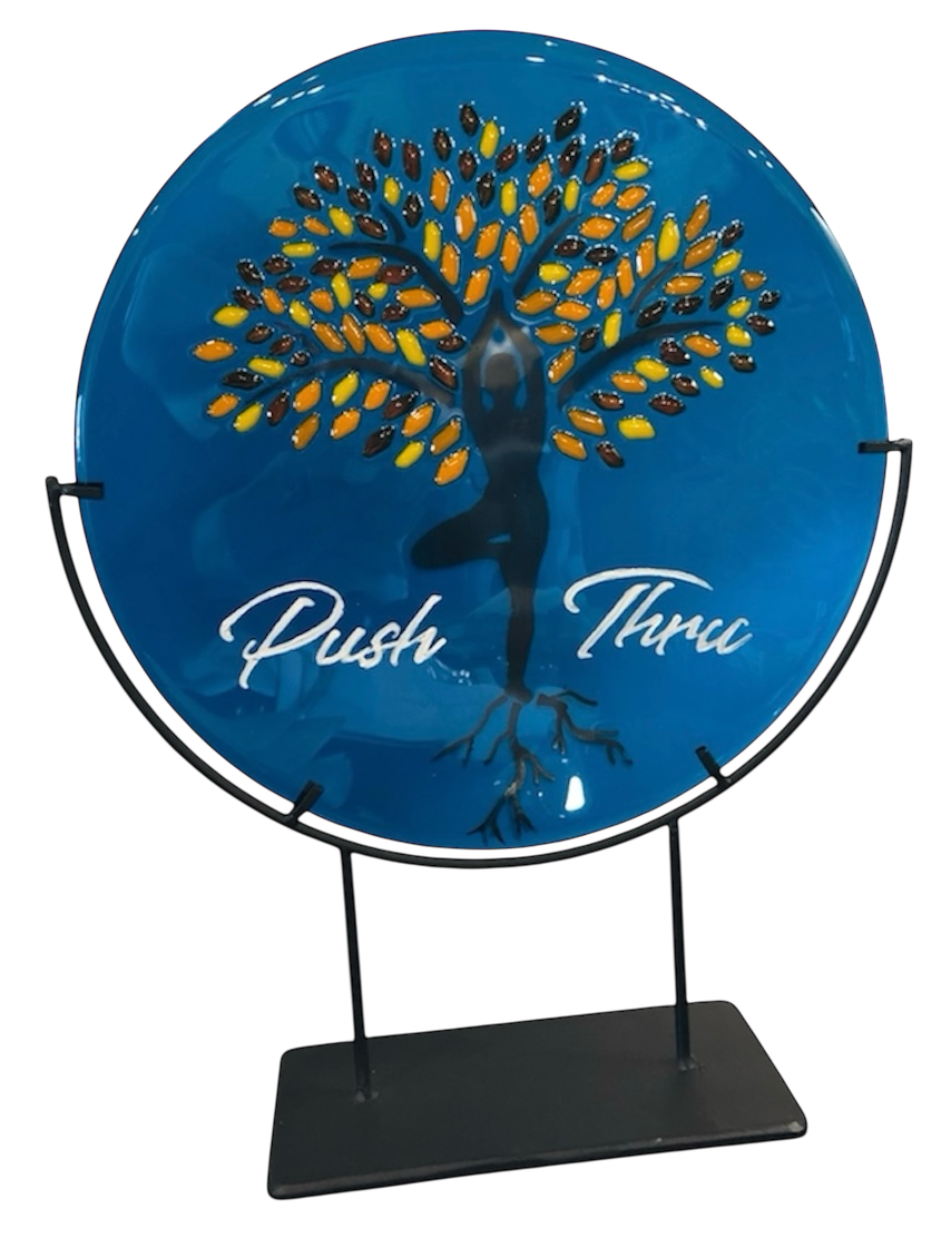 This glass artwork was created to reflect the spirit of balance, growth, and renewal at the heart of this yoga and health studio. Set against a bright blue background that evokes open sky and calm breath, vibrant orange leaves emerge with warmth and vitality. At the center, a flowing yoga silhouette extends downward, transforming seamlessly into the roots of a tree.