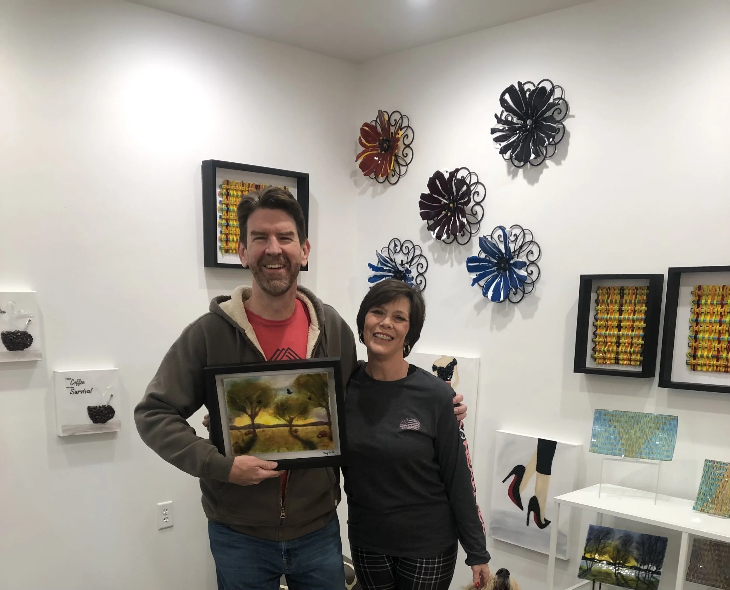 A custom glass art piece was created to memorialize a customer’s first date with his wife, capturing the atmosphere and emotion of that unforgettable evening. The scene reflects a warm fall night in Texas, when the sky was alive with deep oranges, purples, and fading blues of sunset stretching across the horizon. Subtle textures and flowing colors in the glass echo the movement of the autumn sky, giving the piece a sense of warmth and quiet romance.